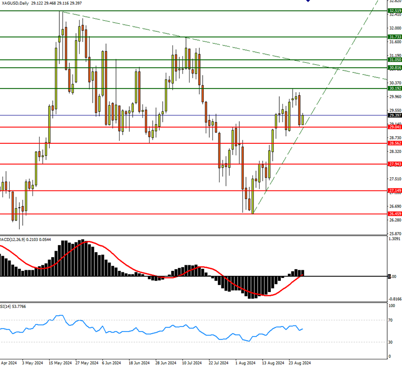 日线图看,下方支持在29.04、28.56水平,目前上涨趋势线持续,进一步突破30.20水平后关键阻力在30.80-31.00区间,也是从5月高点至今的下压阻力线,只有突破该阻力才有望挑战31.70、32.50的历史高点。